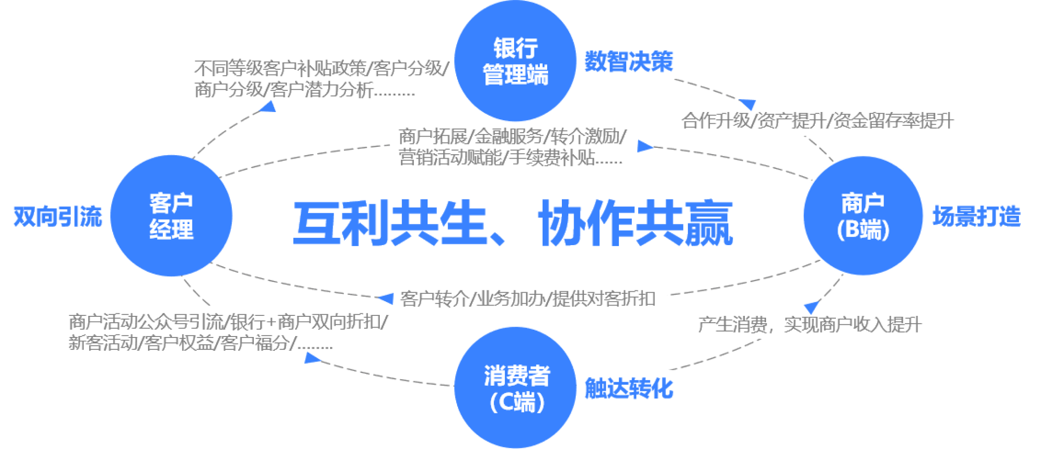 金融场景生态营销一体化平台以微信生态为核心载体,深度整合以移动支付、智慧场景、大数据、微信营销生态、银行金融赋能等能力,以企业科技力量打造一体化平台,构建银行业务场景化运营新范式。平台通过打通银行-商户-客户的全链路数智化连接,实现三大核心价值: