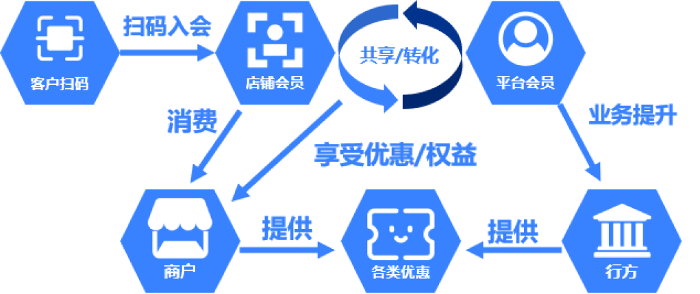 扫描商户收款码支付时系统自动开通店铺会员,商户可在后台按不同会员等级配置差异化优惠券(成本自担,银行可额外叠加),形成 “商户自主优惠 + 银行联合营销” 双重叠加模式,使商户专属优惠与银行平台促销(如满减、折扣等)可同时生效。该模式为商户提供常态化运营工具,借助银行生态资源降低获客成本,形成 “支付即会员、优惠即引流、共建支付体系” 的良性循环,同时支持商户会员与营销系统会员双向 / 单向共享,实现银行客户为商户赋能、商户流量为银行获客的双向价值转化。